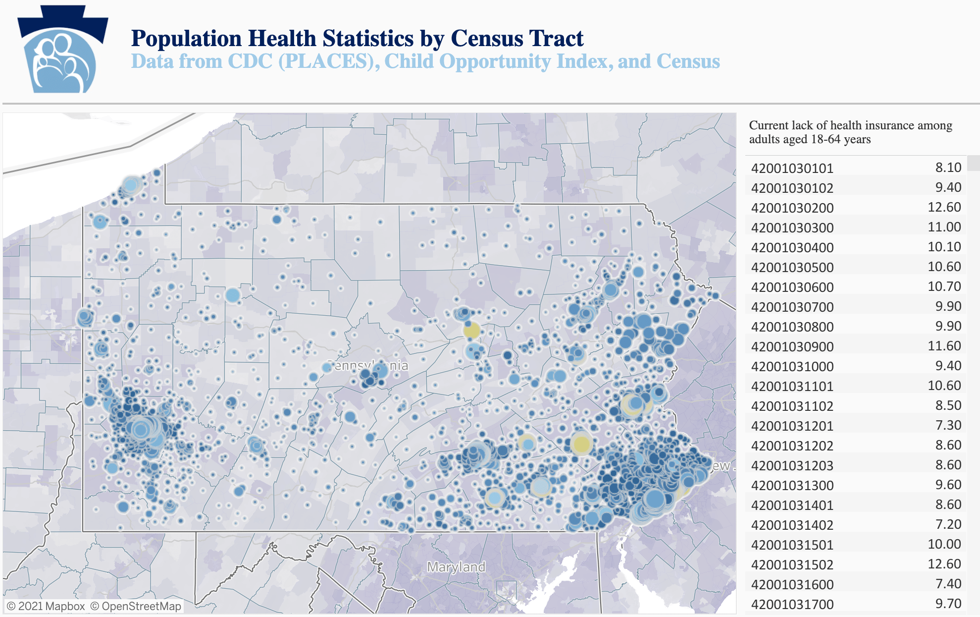 Data on food insecurity, Medicaid enrollment, health statistics, social determinants, environmental factors and historic redlining are all available to view on PA HEAT.